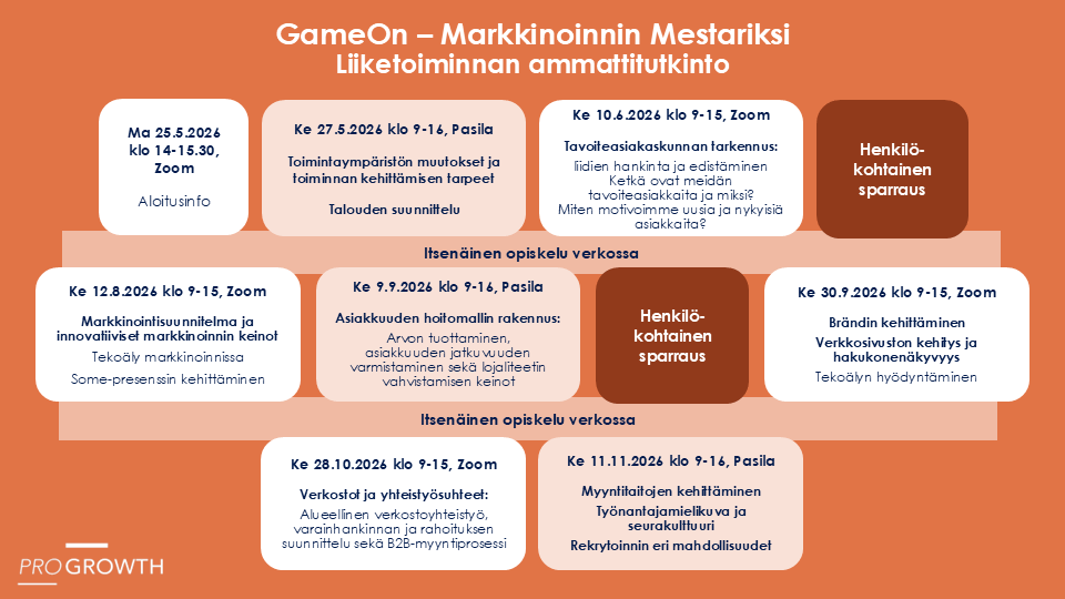 GameOn – Markkinoinnin mestariksi -koulutusohjelma johtaa liiketoiminnan ammattitutkintoon (150 osp). Tutkinnon suorittaminen tuo tekemiselle selkeän rakenteen, tavoitteet ja mitattavan lopputuloksen. Tutkinto ei ole vain nimellinen, vaan sen kautta viet kehitystyön aidosti maaliin ja saat siitä myös konkreettisen tunnustuksen.