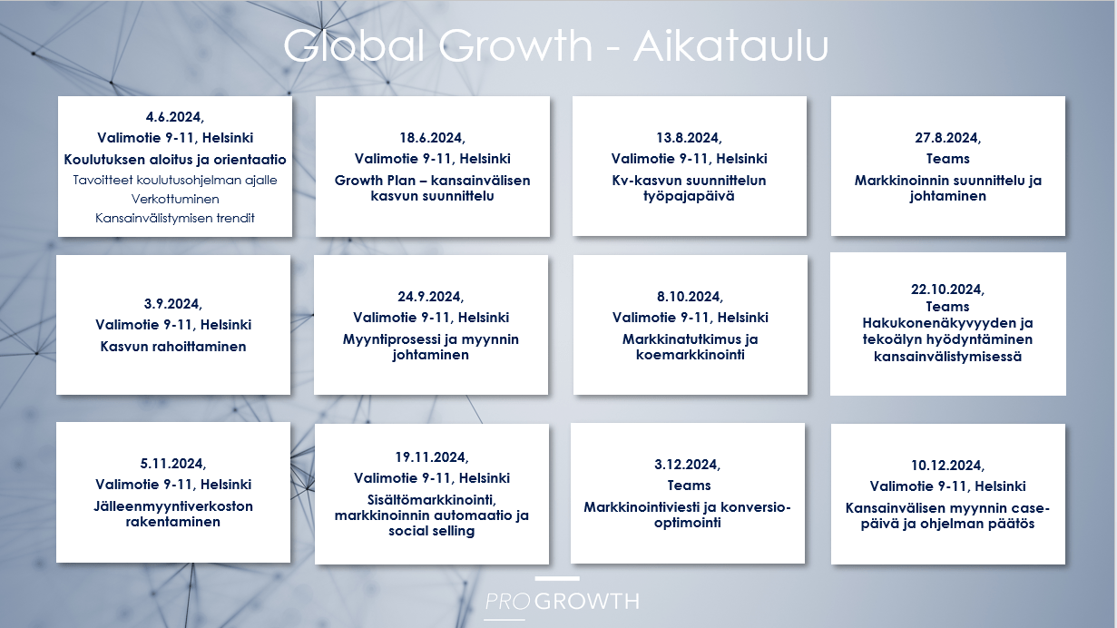 Global Growth -koulutusohjelmassa opit menestyvien kansainvälisen yritysten parhaita käytäntöjä ja saat mukaasi olennaiset, yrityksesi kansainvälistymistä tukevat suunnitelmat.