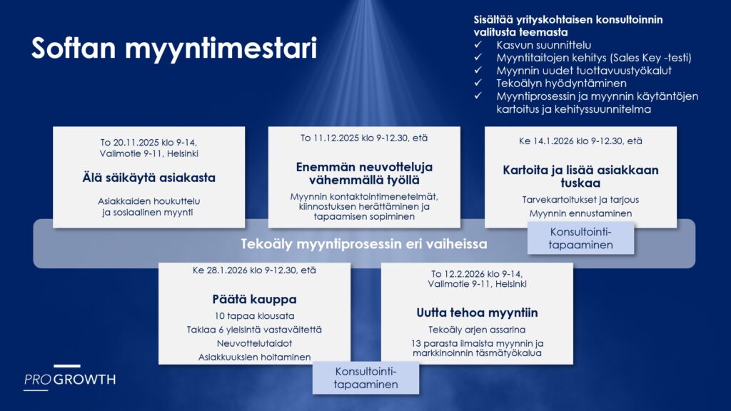 Hinta sisältää koulutusohjelman sekä kaksi yrityskohtaista tapaamista Pro Growthin konsultin kanssa valitun teeman äärellä.